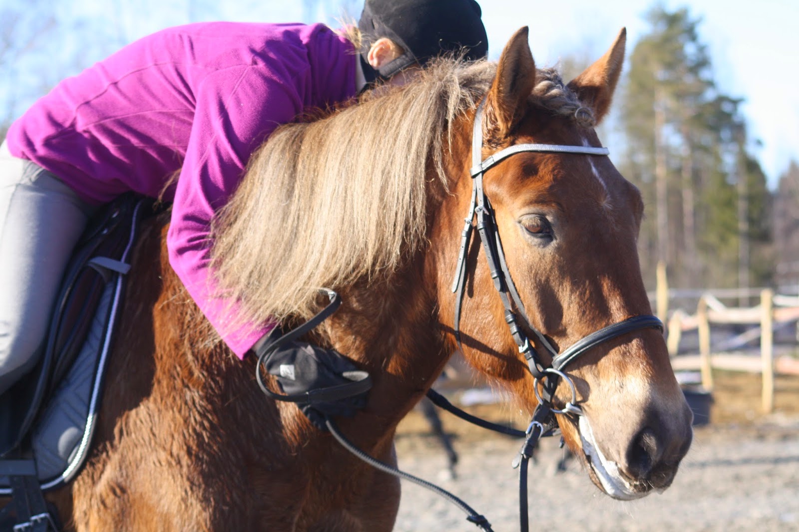 Keskiviikkona meillä oli ratsastustunti. Sanoin opettajalle, että meillä on ollut ongelmia laukan nostamisen kanssa. No, eipä ollut enää. Tella liikkui tunnilla tosi kivasti! Kokoajan sain pidempää pätkää ratsastettua sitä hyvin peräänannossa niin, että se kulki samalla myös eteen. Se oli tosi palkitseva tunne!! Laukatkin nousi molempiin suuntiin. Laukkakunto Tellalla on vielä tosi huono, se väsyy todella nopeasti, eikä oikein taivu ympyrälle tai kanna itseään laukassa kovinkaan hyvin. Tarvitaan siis lisää harjoitusta ja aikaa, jälkimmäistä etenkin.